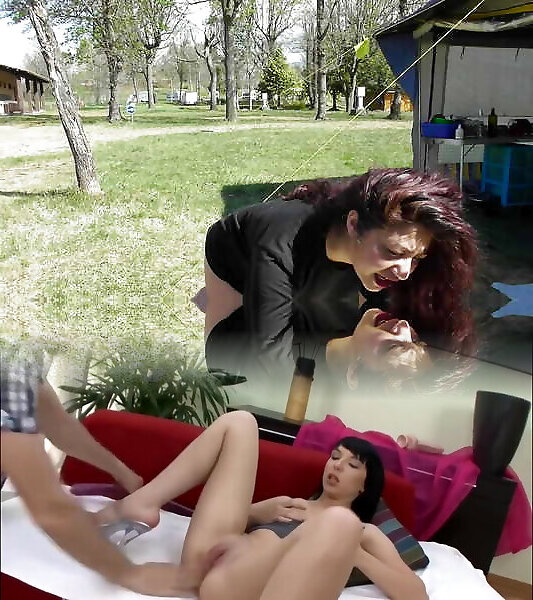 Red-hot Domme Lara is petting her yam-sized breasts and strokes at lesbian strapon banging beach
