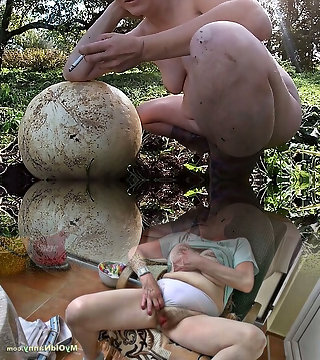 Smoking naked outside while playing big natural mature jugs