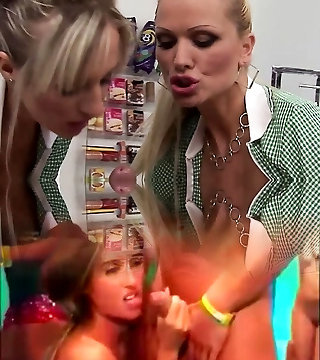 A grocery store foursome begins when the two blonde milfs tease their customer with their big boobs