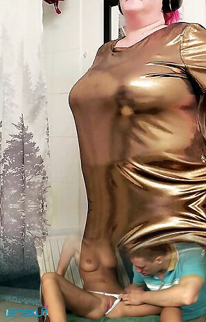 Hottie in tights gulping piss
