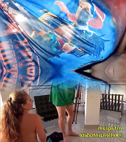 With her costume she plumbs the dark-hued guy