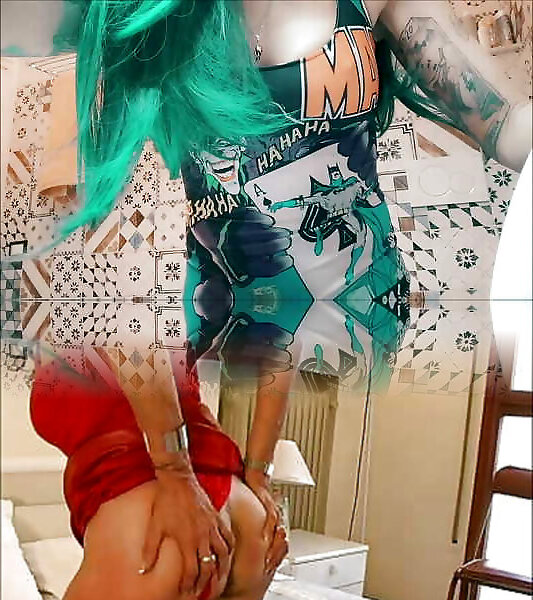 Cosplay Harley Quinn with an anal invasion ass-plug in bootie shows stilettos