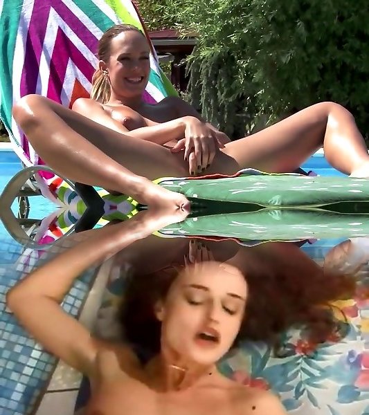 Steaming babes Mel and Angelic open up each others tight cunts by the pool