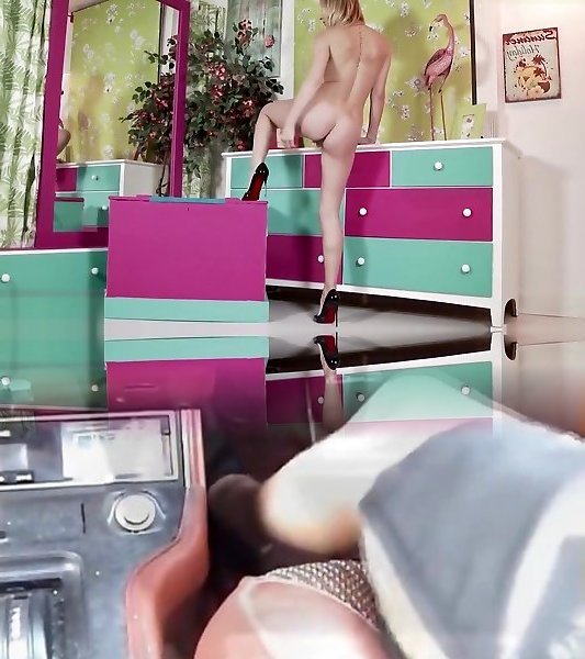 Tall blonde banging in stockings and high-heeled slippers