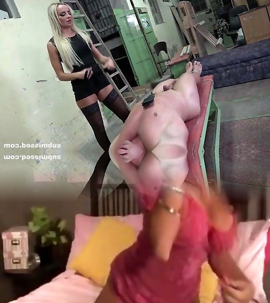 Rigorous mistresses slap and peg guy in group during domination