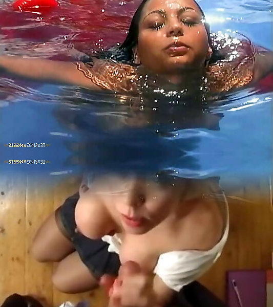 Frolicking in the outdoor pool stops as the brown-haired gets her