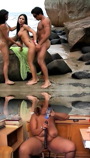 Ravishing dark haired milfs with congenital cupcakes adore three ways at the beach that include rectal orgy