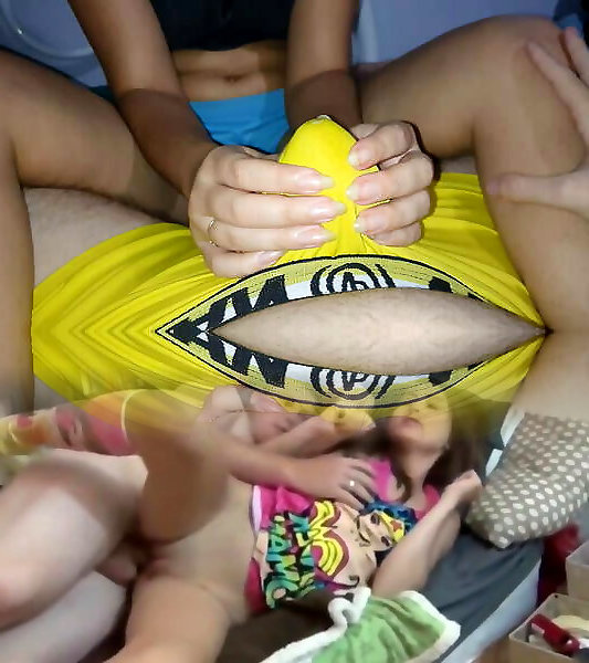 Hand-job through lingerie, cock-squeezing briefs, spunk in trousers