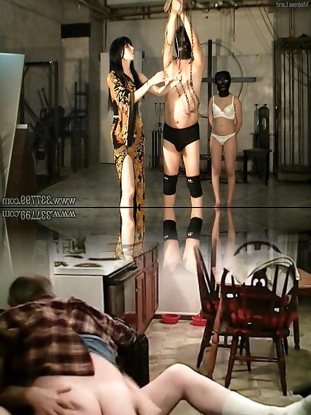 2 Chinese hoes dangling on straps as they are bdsmed