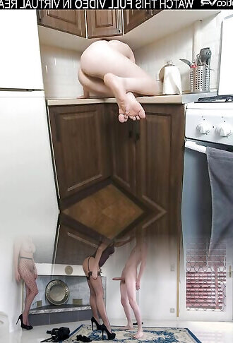 solomädchen sara bork spielt mit einer rasierten muschi in der küche, während sie ihre großen titten in vr streichelt