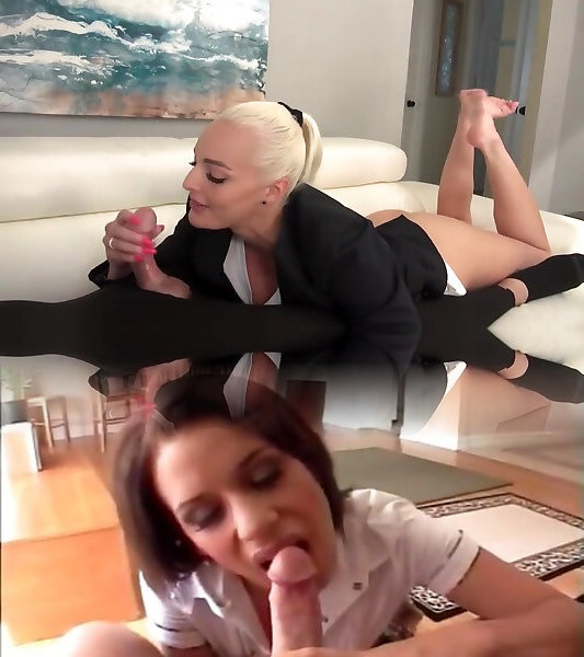 нейлоновые блондинки тренируют своего ножного раба и доят его в обуви