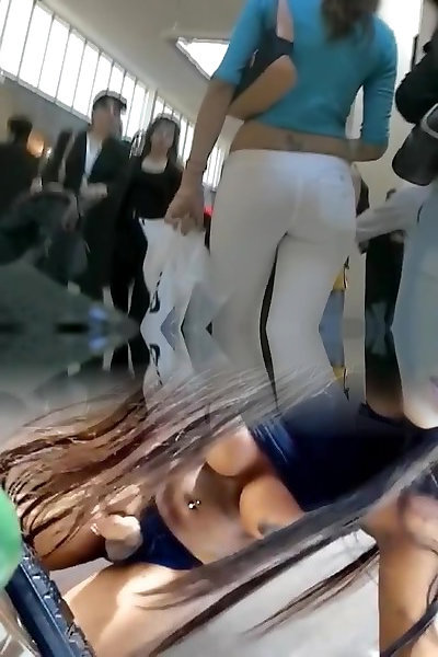 ?伤害调情在紧的白色裤子被记录在间谍相机