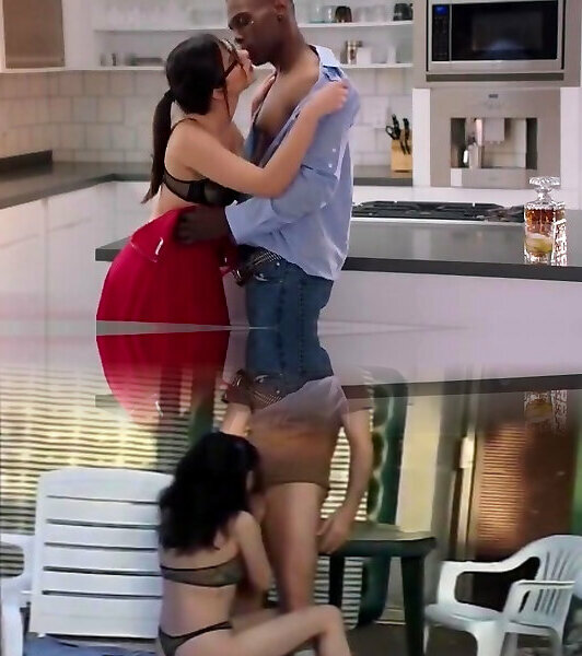 放荡的妻子得到双重渗透从两个深色的男人为她的cuck丈夫